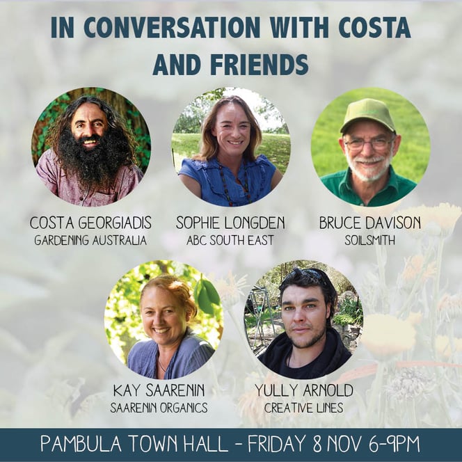 Come and join us at Pambula Town Hall for an evening discussion on regenerative agriculture with Costa Georgiadis (Gardening Australia), Sophie Longden (ABC South East), Bruce Davison (Soilsmith), Kay Saarinen (Saarinen Organics) and Yully Arnold (Creative Lines)